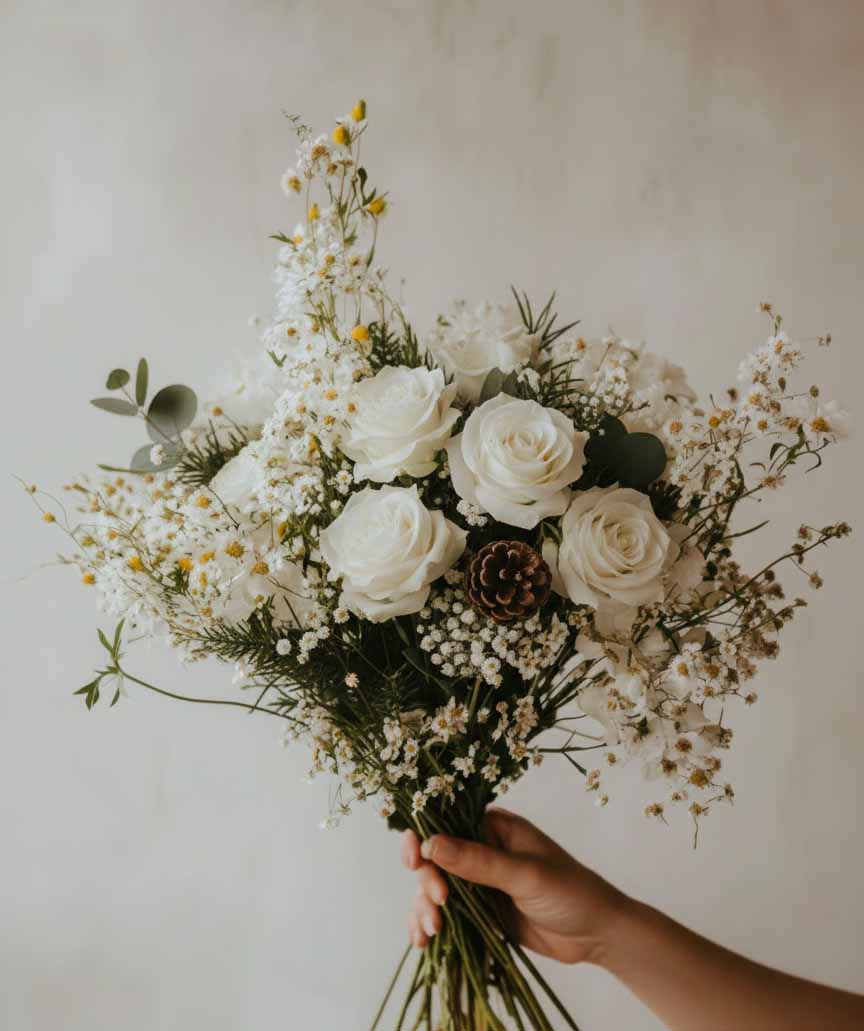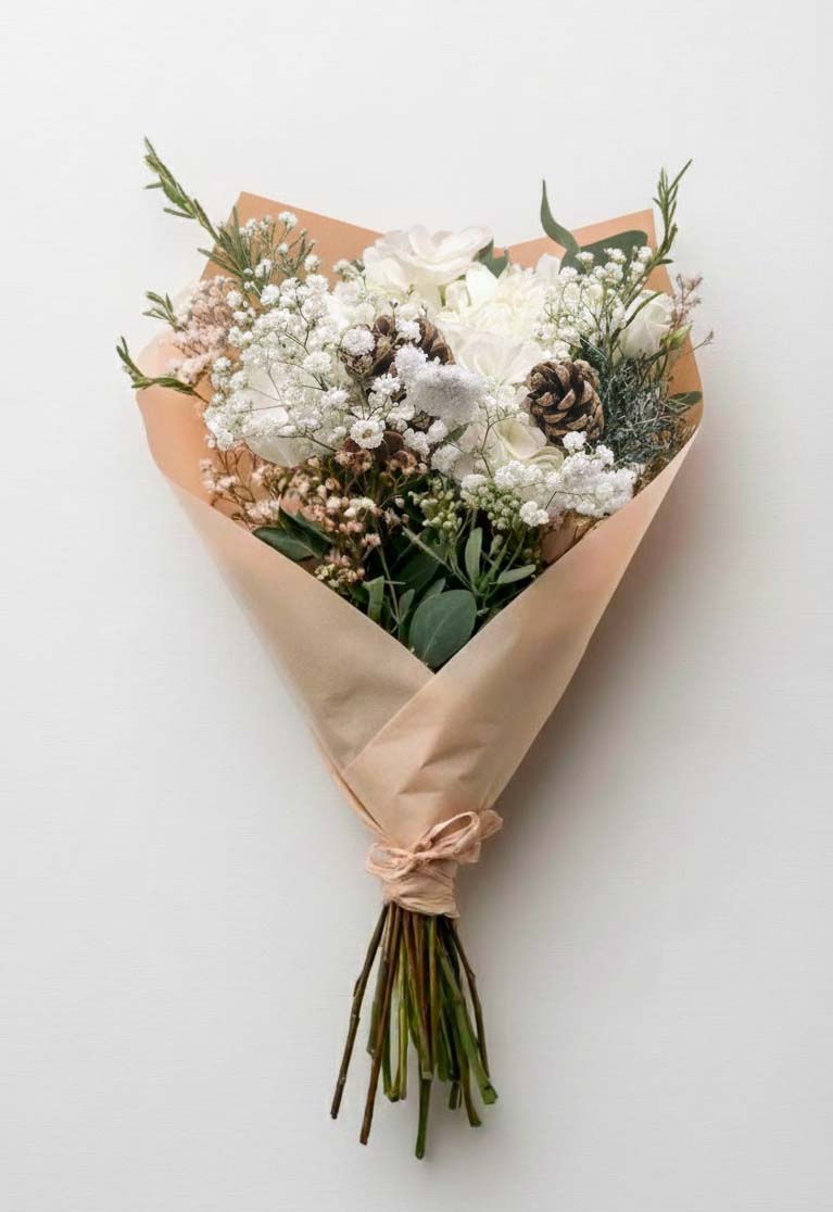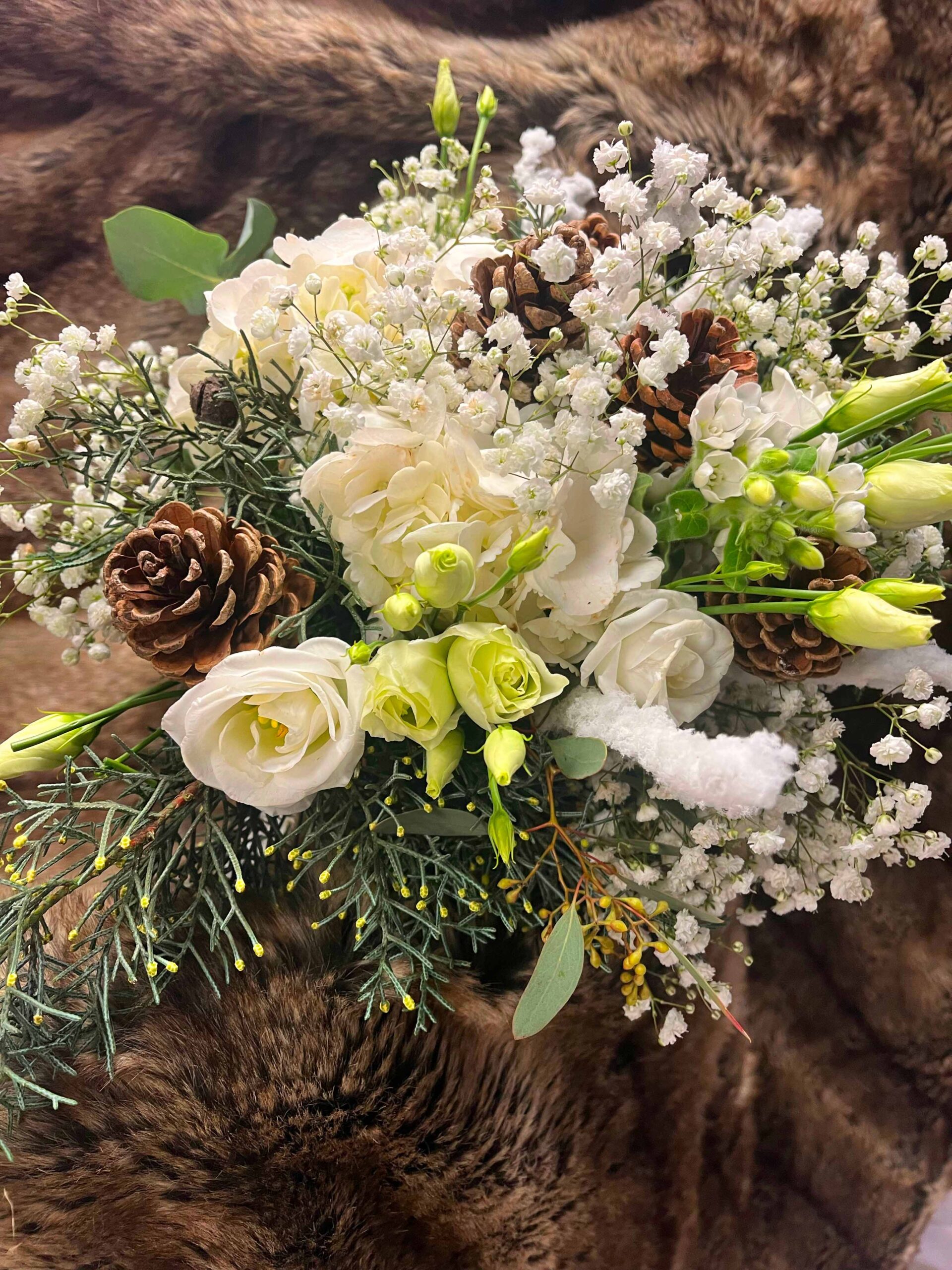 Le Bouquet flocon est une composition artisanale capturant l’élégance de l’hiver. Il mêle de somptueuses fleurs blanches (Hortensia blanc, Lisianthus, Gypsophile) à des éléments naturels comme les Pommes de Pin et le feuillage de conifères. Avec ses touches de fausse neige givrée, ce bouquet crée une ambiance chaleureuse et sophistiquée, idéale pour les fêtes de fin d’année ou un mariage hivernal.