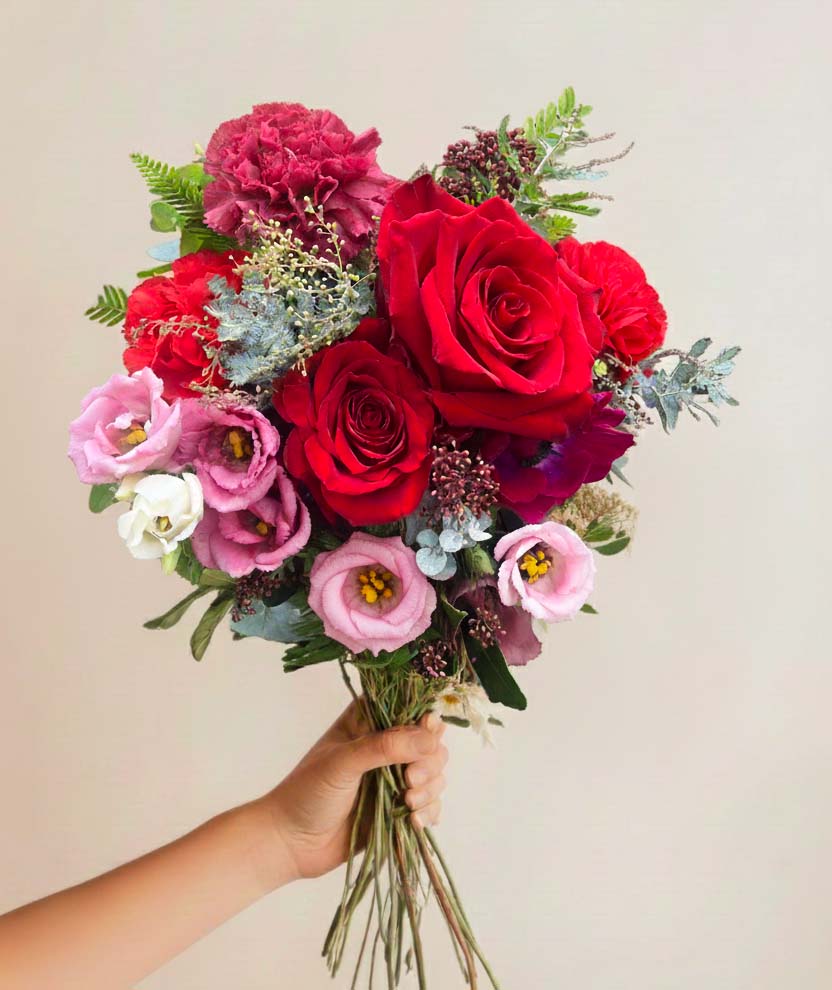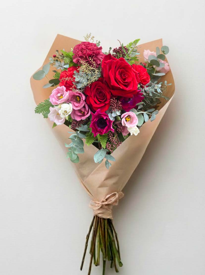 Ce bouquet de Noël rouge réunit la passion des Roses et des Œillets rouges, adoucie par la finesse du Lisianthus. Le mélange est sublimé par le contraste moderne du Sapin et de l’Eucalyptus aromatique, enrichi par des touches de feuillage à baie.